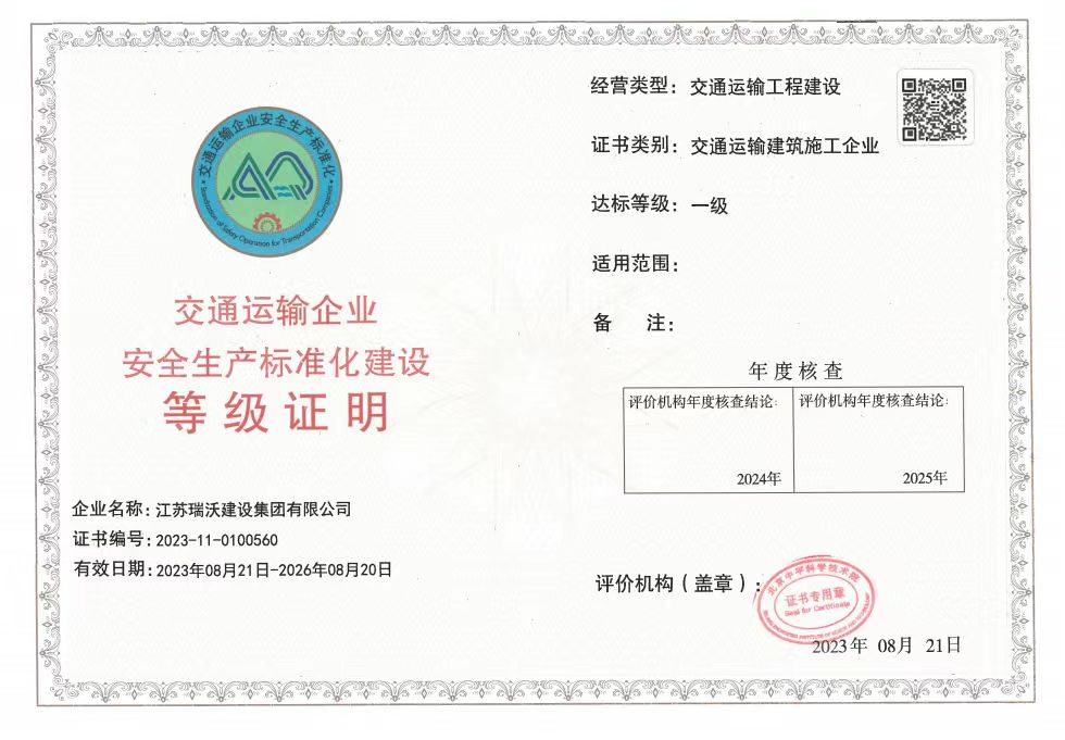 江蘇瑞沃建設集團有限公司成立于2007年,是一家以市政、交通工程建設為主導,集房屋建筑、交通安全設施、城市道路照明工程、電力工程、隧道工程、航道工程及投融資為一體的綜合性企業(yè)。企業(yè)注冊資本60000萬元,現有各類技術人員580人,其中中、高級以上人員498人,注冊類人員268人,一、二級建造師166人。公司榮獲“江蘇省建筑業(yè)優(yōu)秀企業(yè)”、“江蘇省五一勞動獎狀”,連續(xù)多年被評為“揚州市先進企業(yè)”、“江蘇省建筑業(yè)百強企業(yè)”,連續(xù)八年蟬聯(lián)百強企業(yè)基礎設施類第一名。